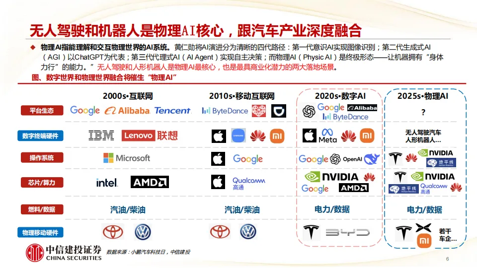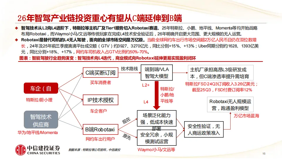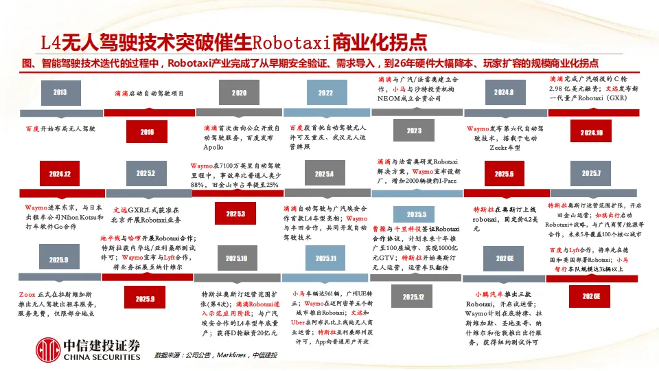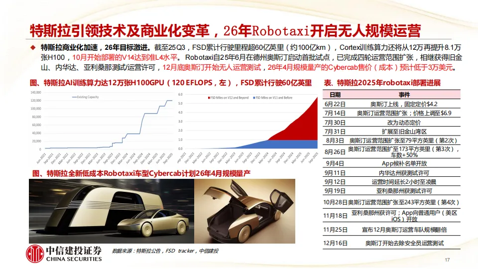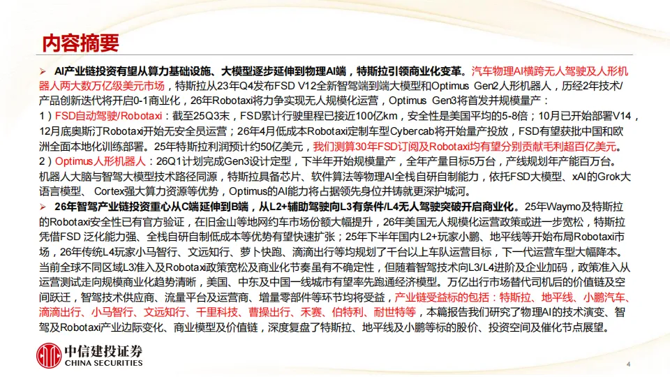 我们看好2026年特斯拉引领全球物理AI端侧(智能驾驶及机器人)变革,随着智驾端到端大模型率先跑通,公司有望进入新一轮加速成长周期,商业模式从硬件产品销售延伸至软件订阅及出行运营,2025年Q4部署的FSD V14已达到准L4水平,Robotaxi即将无人规模化运营,FSD订阅率从12%加速提升,Optimus Gen3定型发布后开始规模量产,下一代AI5/AI6端侧芯片性能跃升进一步加速物理AI能力迭代。