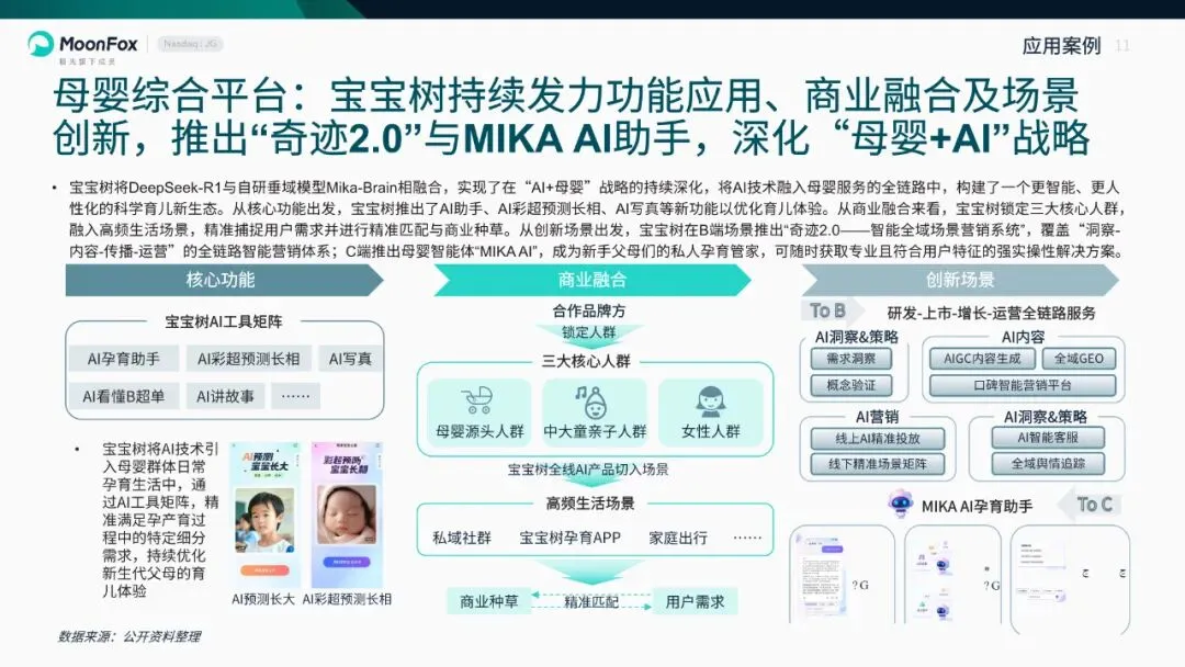 1. 垂域模型突破宝宝树Mika-Brain、孩子王KidsGPT等专用模型通过检索增强生成技术,解决通用模型在母婴领域的知识局限。DeepSeek开源生态推动大模型平权,降低技术应用成本。