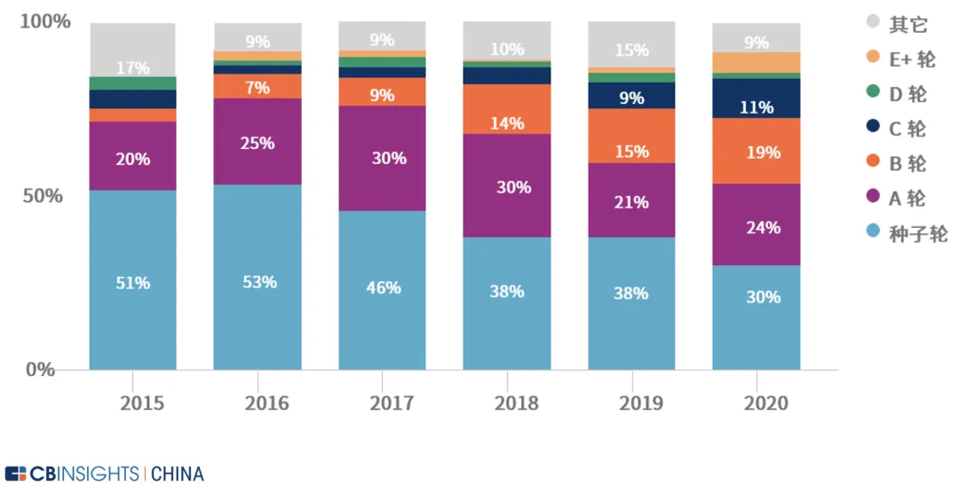 美国是 AI 制药领域融资交易的主要地区,中国紧随其后。从地区分布上看,美国仍然占据了融资交易的主要份额,近 5 年来在 AI 制药领域有 50.6% 的融资交易发生在美国。中国以 9.4% 的比例紧随其后,成为了除美国外最大的新兴市场,超越了英国、韩国、以色列等传统科技强国。这也展现了中国市场在新兴科技领域发展的巨大的潜力。在 AI 制药这类新兴赛道上越来越多中国企业的身影涌现。图 | 融资轮次统计(来源:CB Insights 中国)