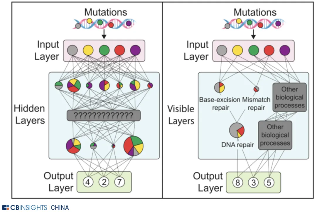 一般而言,用于 AI 制药的深度神经网络通常含有输入层、隐含层和输出层三层结构。生物数据首先需要转换为输入值数组,然后这些值被输入隐藏层运算。深度神经网络的其中一个挑战便是定义网络的深度和宽度即隐藏层和每层节点的数量。一层中的每个节点从前一层的所有节点获取输入信息,然后对输入信息进行数学变换,之后再进行正向反馈。最终在输出层输出输入数据的最终演算结果。其中所涉及的非线性转换的数量越多,对最高级别层的解释也就变的越困难。此类网络目前主要是通过不断迭代输入值数组,根据输入和输出结果之间的关系来评估模型特征和权重。通过归因分数、相关性系数或权重共享系数等方法给出特征重要性评分。图 | 两类深度学习网络结构(来源:Cancer Cell,CB Insights 中国整理)