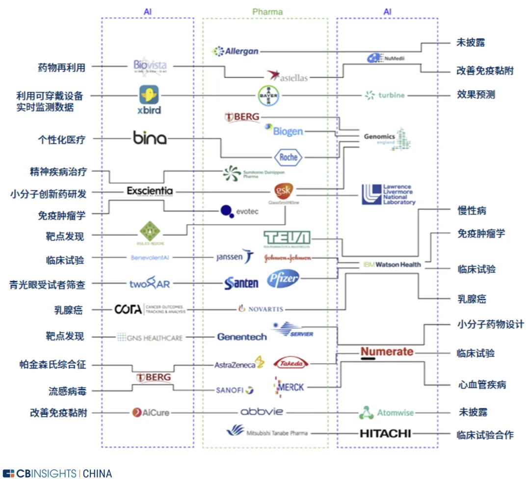 另外一种深度神经网络模型则选择用可见层取代隐藏层。这类算法主要基于统计学和生物信息学的知识图谱,利用生物学底层逻辑将运算串联起来,使得每一层的数据产生机理得到解释。这一类型的可见层中往往采用基因本体论(Gene Ontology)等生物信息学相关网络结构来定义输入层和输出层的连接方式,因此输出层的计算可以通过网络回溯。2020 年 Kuenzi 等人便使用从基因本体论衍生的层次结构的深度神经网络对肿瘤对药物的敏感性进行了建模,取得了重大突破。这两种类别的深度神经网络模型在确定性判断上是有差异的。对于许多基础的生物问题,第一类深度神经网络通常可以实现很高的预测精度,但很难将预测的方式和原因结合起来,而第二类模型则可以有效改善这一问题。同样,受限于现阶段理论研究的边界,第二类模型往往在模型深度上受限,或者需要极高的算力支撑。在确定性上,第二类模型理论上可以通过数理逻辑自证,而对于第一类深度神经网络模型,由于隐藏层的内部运算是相对未知的所以很难进行数据溯源,模型输出结果的确定性通常采用后期实验验证的方式来证明。整体来说目前 AI 制药验证的链条相对较长,因此在未来建立高通量高效的实验评价体系对 AI 制药企业来说尤为重要。数据、算力和算法是目前 AI 制药企业的三大技术核心。数据方面,原始数据通常来自三个方面,公开数据集例如 PubChem、ChEMBL 等、与药企合作获得的研发数据集、企业自身研发积累的数据集。原始数据会经过多轮数据清洗最终获得可以用来建模的数据。算力方面,GPU 云计算资源等为 AI 制药企业提供了重要的计算支撑。数据和算力是 AI 制药企业的基石,基于此 AI 制药企业可以搭建出自己的底层知识图谱,并形成其行业壁垒之一。目前药物研发新基建还处于早期搭建的阶段,但随着各大数据库的开源以及云计算平台的普及,数据和算力已经逐渐不再成为制约其发展的决定性因素。对于 AI 制药企业来说更为核心的壁垒是算法,其核心创新点在于建模的精度和产生新信息的能力。深度学习的迭代算法可以有效地整合模板建模和自由建模,进而开发出动态可迭代的特异性约束条件,从而提高建模精度。另一类由自监督学习等方法产生的共进化模型,则能够从无到有地产生出新的生物学信息,拓宽人类的知识边界。这些创新优势是其它传统制药手段难以达到的。透过 AI 精确的建模和新的生物学相关信息的产生可以加深我们对人体复杂生理生化模型的理解,进而在药物发现阶段即可与临床试验相结合,找到合适的分子。通过前期低成本的高效的AI 赋能来降低后期临床试验的成本和失败概率,从根本上改变临床试验阶段投入大成功率低的现象。从制药的流程看,AI 技术已经在多个环节找到了适合自己的应用场景,并发挥出巨大潜力。从临床前药物发现阶段到药物研发后期临床试验阶段,AI 技术已经渗透到药物研发诸多环节。例如基准化合物设计、预测疾病靶点、预测信号通路、预测成药靶点、确认新靶点、硅化合物库设计、预测药物结构与活性的关系、预测 ADMET 性质、优化药物反应试验、选择受试人群、药物警戒和转录组数据查询等。现阶段 AI 在药物研发需要大数据分析和高通量测试的阶段优势最为明显。例如在根据海量文献筛选靶点、专利追踪、批量性质预测等方面,药企便可以通过使用人工智能相关技术降低大量制药成本。图 | 药物研发各环节中 AI 的作用(来源:Drug Discovery Today,CB Insights 中国整理)不断取得的突破性进展也给 AI 制药的未来带来了空前的想象力。人工智能技术与生物制药领域的结合不仅将药物发现、临床前研究的时间缩短接近 40% 还可以节约临床试验阶段约 50%-60% 的时间。每年近 260 亿美金的化合物筛选成本和约 280 亿美金的临床实验费用也可以通过 AI 制药技术节省出来。面对创新药研发领域日趋激烈的同质化竞争,AI 技术在药物研发过程中带来的诸多底层创新无疑也展现出了巨大的价值。基于AI 技术的特有优势,许多大型药企开始在这一领域积极布局。部分国际药企早早的便开始和人工智能企业展开了合作。其中默沙东和葛兰素史克与 AI 平台的合作最早也最为频繁,其次是拜耳(Bayer),武田制药(Takeda Pharmaceutical),阿斯利康(AstraZeneca),赛诺菲(Sanofi)和罗氏(Roche)。2012 年,默沙东首次与 Numerate 公司合作开展心血管疾病的研究。葛兰素史克自 2012 年以来已经与 Insilico Medicine、Exscientia、Deep Intelligent Pharma 和 Cloud Pharmaceutical 四家 AI 平台企业建立了合作。在所披露的合作当中,神经退行性疾病和癌症方向是目前合作的两大热门领域,心血管以及胃肠道疾病领域也有所涉猎。杨森制药与 Benevolent AI 合作,在帕金森氏症领域展开小分子化合物研究。公司主要利用 AI 系统 JACS 从论文、临床试验中提取数据,提出新假设从而加速新药研发。GNS Healthcare 与 Gene tech 合作利用 GNS 分析平台在肿瘤学方向展开研究。他们将大数据、机器学习和仿真技术结合起来判断疾病预后效果,从而辅助医疗供应商进行市场决策。图 | 药企与 AI 企业的合作 (来源:Drug Discovery Today,CB Insights 中国整理)