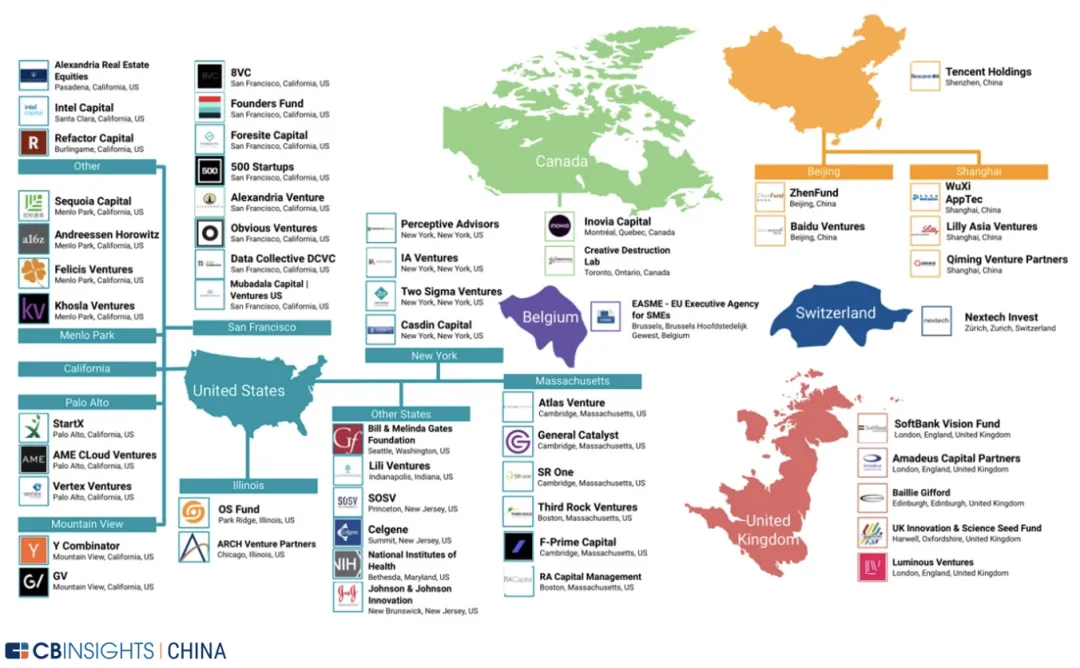 2020 年科技巨头谷歌旗下的 Deepmind 在 AI 药物研发领域取得重大进展,更是进一步点燃了 AI 制药领域的研发热情,各路资本纷涌而至。CB Insights 中国整理了 AI 制药领域 50 大核心投资方,这其中不仅有许多耳熟能详的明星基金也可以发现大型药企的身影。核心 VC/PE 基金重点分布在美国(旧金山、马萨诸塞州、纽约)、中国(上海、北京)、加拿大、英国、比利时、瑞士等国家和地区。这也从侧面展现出这些地区雄厚的资本基础和巨大的创新活力,为 AI 制药初创公司的落地提供了新选择。图 | AI 制药领域50大核心投资方(来源:Deep Pharma Intelligence,CB Insights 中国整理)