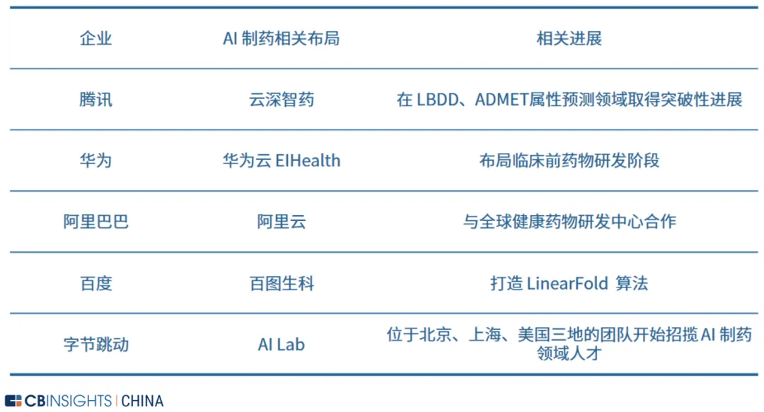 图 | 中国互联网巨头在 AI 制药领域的布局(来源:公开资料,CB Insights 中国整理)