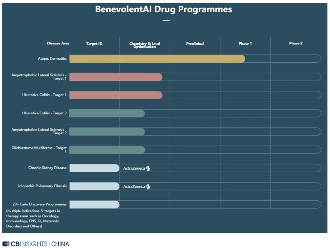 BenevolentAI 是 2017 年 CB Insights 评选的全球人工智能百强公司。公司核心技术是 JACS 人工智能系统,JACS 可以在运算中从论文、临床试验中提取大量的数据,提取推动药物研发的知识,提出新的可被验证的假设,加速新药研发。近年来与诸多药企达成了合作例如与杨森制药合作利用人工智能技术来评估小分子化合物在临床的潜力,特别是在帕金森氏症领域、与阿斯利康合作寻找治疗慢性肾病和特发性肺纤维化的新药,与诺华合作开发癌症相关的药物。2019年 8 月 Benevolent AI 与 Neuropore Therapies 合作研究通过人工智能鉴定的与进行性退行性疾病有关的分子靶点。Benevolent AI 自身也在开发有关于肌萎缩侧索硬化(ALS)的相关药物。图 | BenevolentAI 程序(来源:BenevolentAI 官网,CB Insights 中国整理)