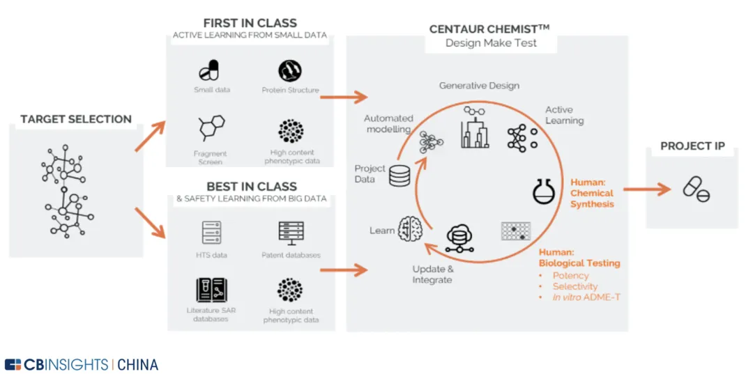 英国 AI 药物发现公司 Exscientia 成立于 2012 年,目前已与葛兰素史克和罗氏建立了常规研究合作项目。2019 年 4 月,Excientia 向葛兰素史克交付了第一个通过人工智能发现的候选药物,这是一个治疗慢性阻塞性肺病(COPD)的潜在疗法。除此之外,Exscientia 还与赛诺菲合作开发了有关代谢性疾病的疗法;与新基公司合作开发了针对癌症和自身免疫性疾病的疗法。2020 年 1 月,拜耳宣布与 Exscientia 在心血管疾病和肿瘤药物研发方向展开合作,项目金额达 2.4 亿欧元。在融资方面,Exscientia 在 2019 年 1 月完成了 2500 万美元的B轮投资,该轮融资由新基公司、GT Healthcare Capital 以及 Evotec 共同参与完成。图 | Exscientia 服务流程(来源:Exscientia 官网,CB Insights 中国整理)