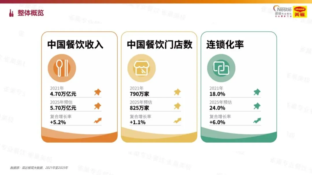 2025年中国餐饮市场收入预计达5.7万亿元,中式餐饮门店数超825万家,连锁化率达24%。市场受“禁酒令”影响,回归日常消费本质,客单价下降,但消费笔数和每单人数上升。