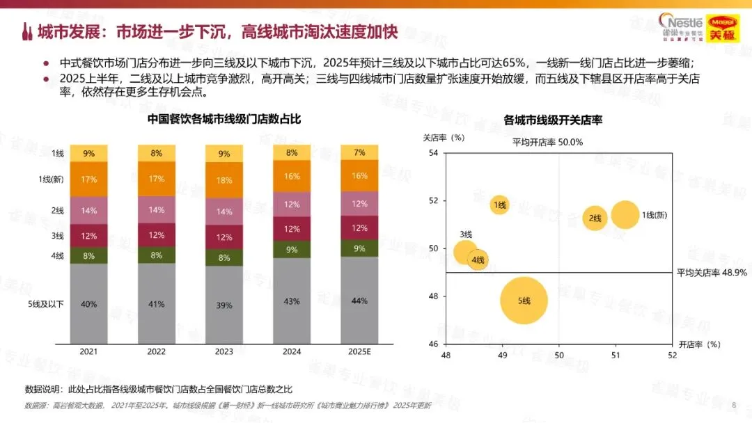 2025上半年,二线及以上城市竞争激烈,高开高关;三线与四线城市门店数量扩张速度开始放缓,而五线及下辖县区开店率高于关店率,依然存在更多生存机会点。