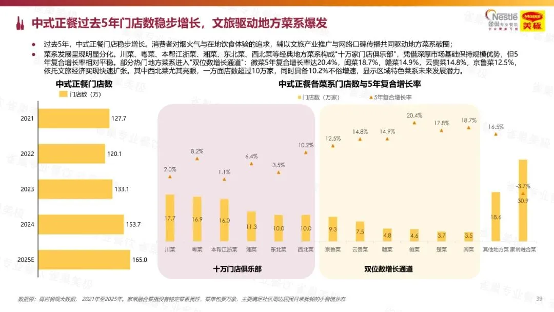中式正餐门店数稳步增长,地方菜系如川菜、粤菜、湘菜等扩张迅速,而中式快餐门店数微降,面条米线等品类逆势增长。