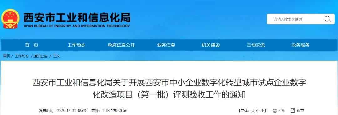 根据财政部、工信部《关于做好2024年中小企业数字化转型城市试点工作的通知》(财办建〔2024〕23号)及《西安市人民政府办公厅关于印发制造业数字化转型及中小企业城市试点实施方案的通知》(市政办发〔2024〕31号)要求,为加快推进西安市中小企业数字化转型城市试点工作,现开展试点企业数字化改造项目(第一批)评测验收工作,具体事项通知如下:
