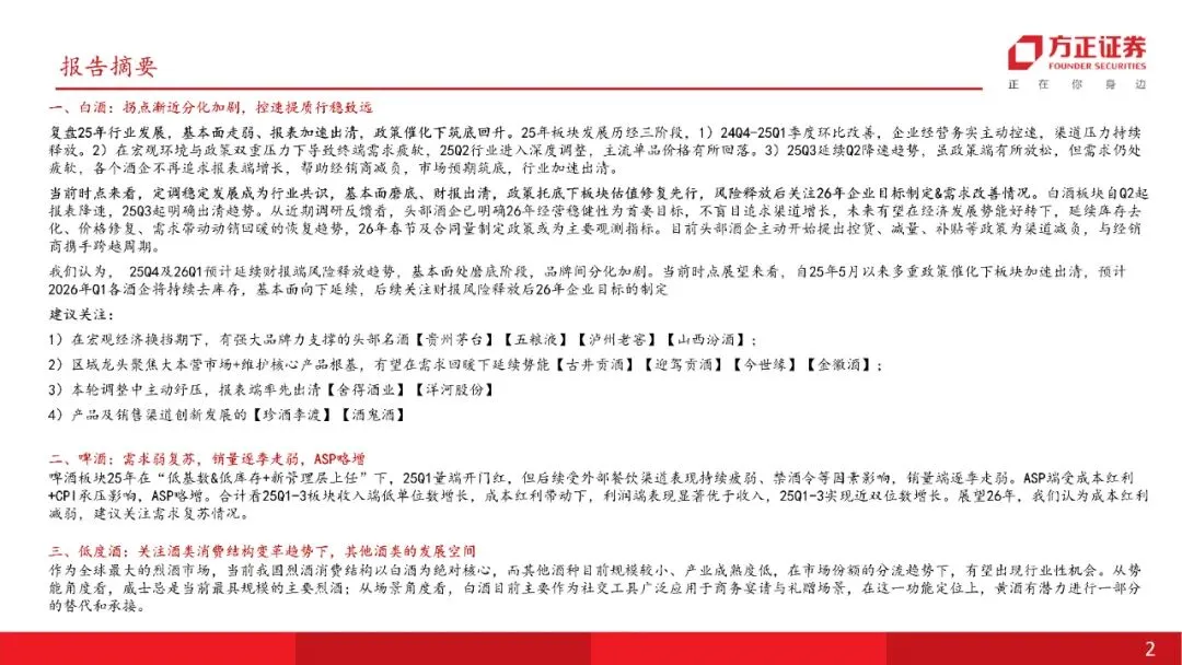 我们认为, 25Q4及26Q1预计延续财报端风险释放趋势,基本面处磨底阶段,品牌间分化加剧。当前时点展望来看,自25年5月以来多重政策催化下板块加速出清,预计2026年Q1各酒企将持续去库存,基本面向下延续,后续关注财报风险释放后26年企业目标的制定
