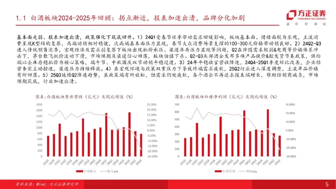 3)25Q3延续Q2降速趋势,虽政策端有所放松,但需求仍处疲软,各个酒企不再追求报表端增长,帮助经销商减负,市场预期筑底,行业加速出清。