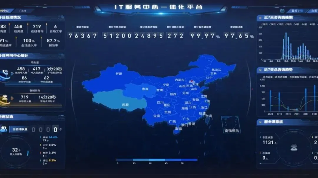 数字化大一线智能服务平台整合950959热线、WeIT应用及各系统嵌入客服机器人三大渠道,形成统一服务入口,引入AI能力,实现需求精准识别、常见问题自动解答、复杂问题辅助决策,提供可视化数据看板支持实时监测各系统运行状态与用户反馈,助力系统持续优化、快速响应故障,推动服务迭代升级。