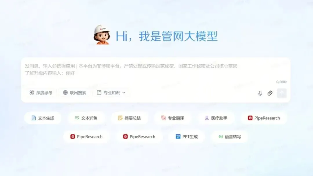 管网大模型聚焦油气行业人工智能应用,构建全国产化的统一大模型底座和AI服务平台,集成制程财税问答、文本生成、语音转写等产品,辅助国家管网全员智能办公。产品已上线29个应用,累计使用201万次,回答准确率达85%以上。该模型在油气行业首批通过中央网信办算法和服务“双备案”。