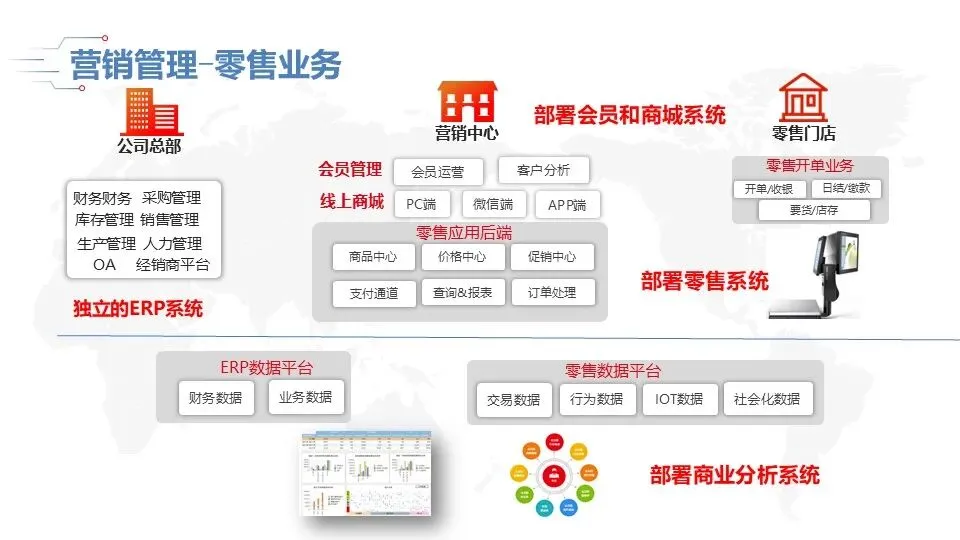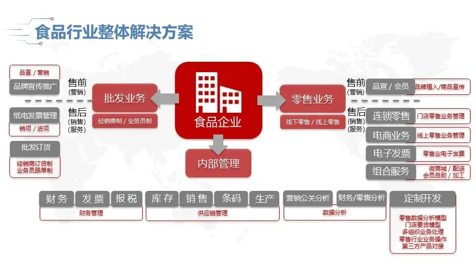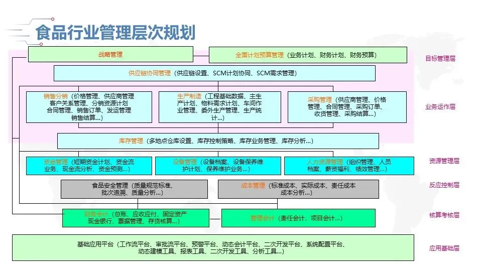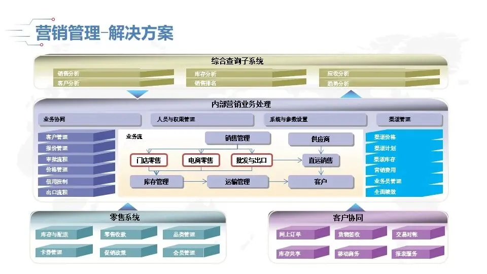 ‑ 人力中台(组织人事、考勤薪资、绩效、培训、HR 共享服务)智能层:AI 预测销量、AI 排产、AI 质检、RPA 财务机器人、大数据洞察(渠道库存、客户价值、单品贡献)。