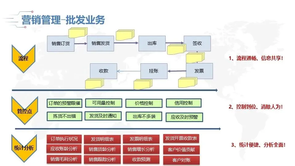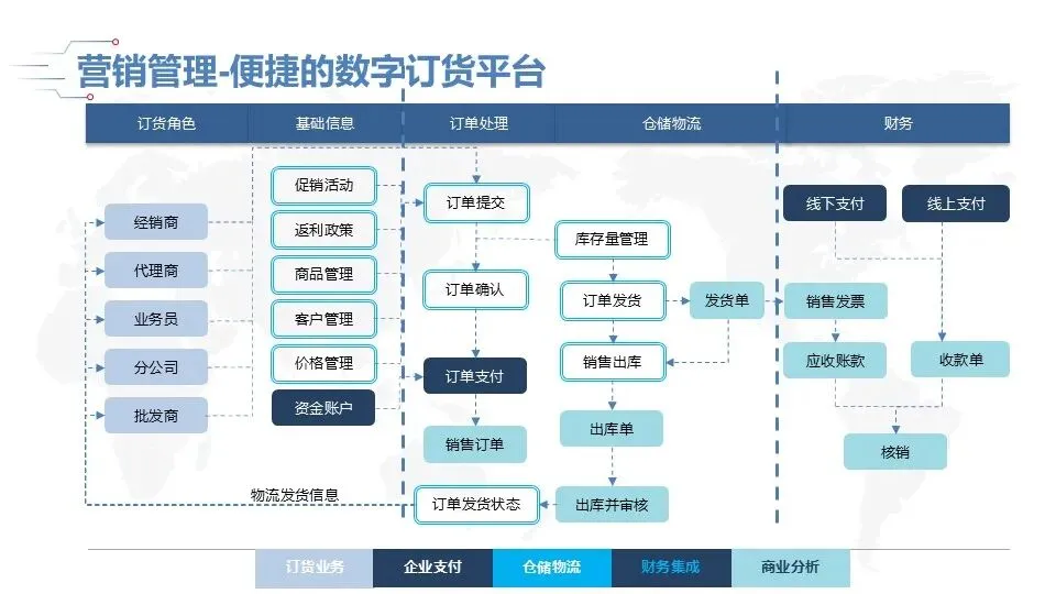 费用闭环:促销、陈列、进场、返利、搭赠 5 大类费用预算→申请→执行→核销→分析,杜绝“费用黑洞”。