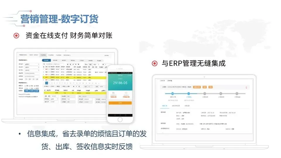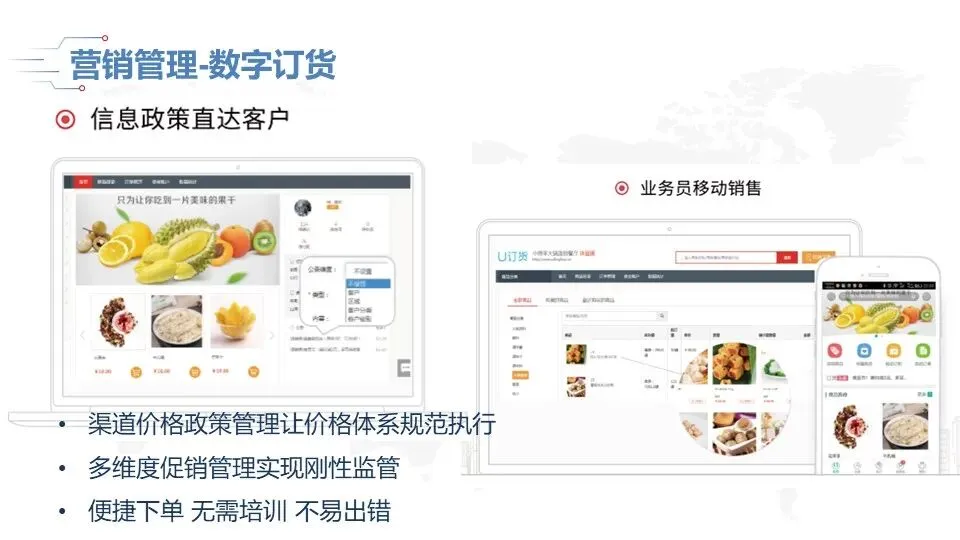 移动订货:业务员抄单、门店自主订货、经销商 B2B 门户,SKU 图片实时更新,下单→收款→发货→物流签收闭环。