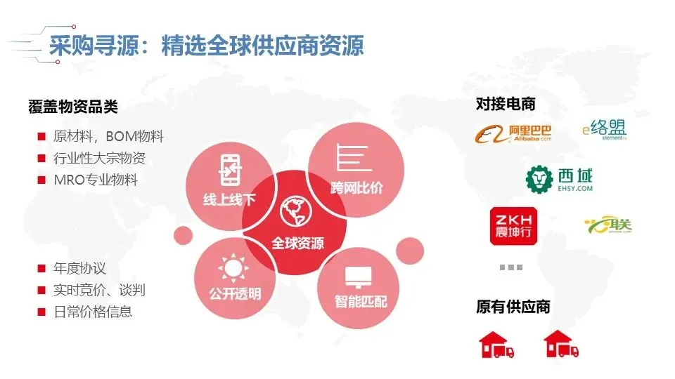 全球寻源:1688、西域、震坤行、京东企业购等电商直连,比价、竞价、招投标;
