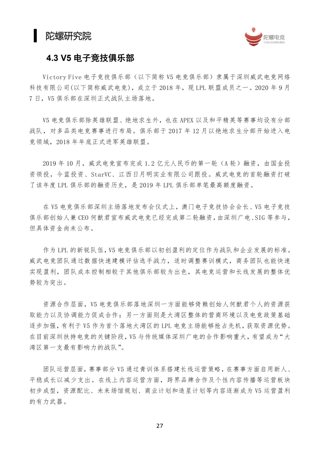 V5电竞俱乐部成立于2018年,现LPL联盟成员之一。2020年9月7日,V5俱乐部在深圳正式战队主场落地。V5电竞俱乐部除英雄联盟、绝地求生外,也在APEX以及和平精英等赛事均设有分部战队,对多品类电竞赛事进行布局。俱乐部于2017年12月以绝地求生分部开始进入电竞领域,2018年年底正式进军英雄联盟。