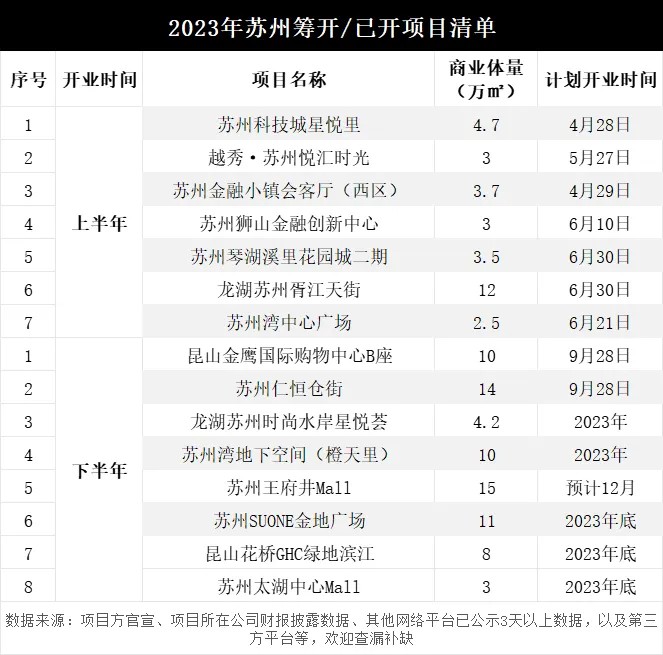 数量方面,2023年苏州预计开业的新商业项目为15个,优于2022年,总商业体量达107.6万㎡;