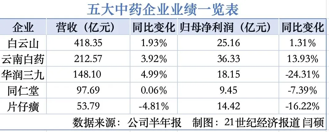 今年上半年,五大中药企业中只有云南白药实现了营收净利双增,报告期内,其实现营收212.57亿元,同比增长3.92%;实现归母净利润36.33亿元,同比增长13.93%,创同期历史新高。