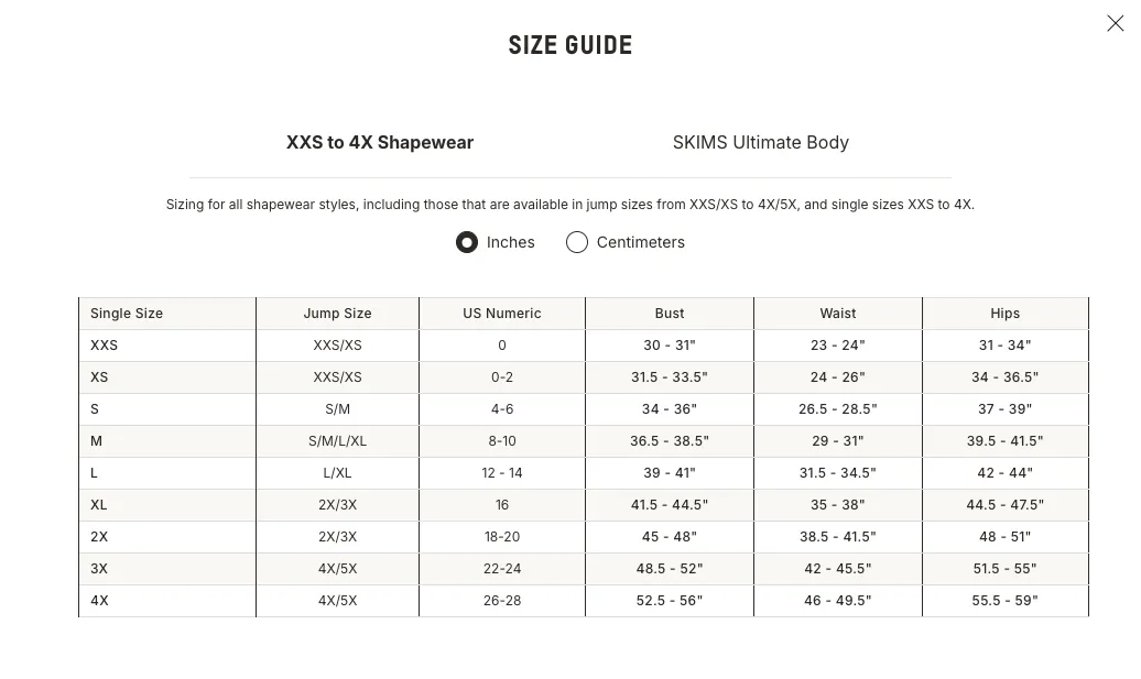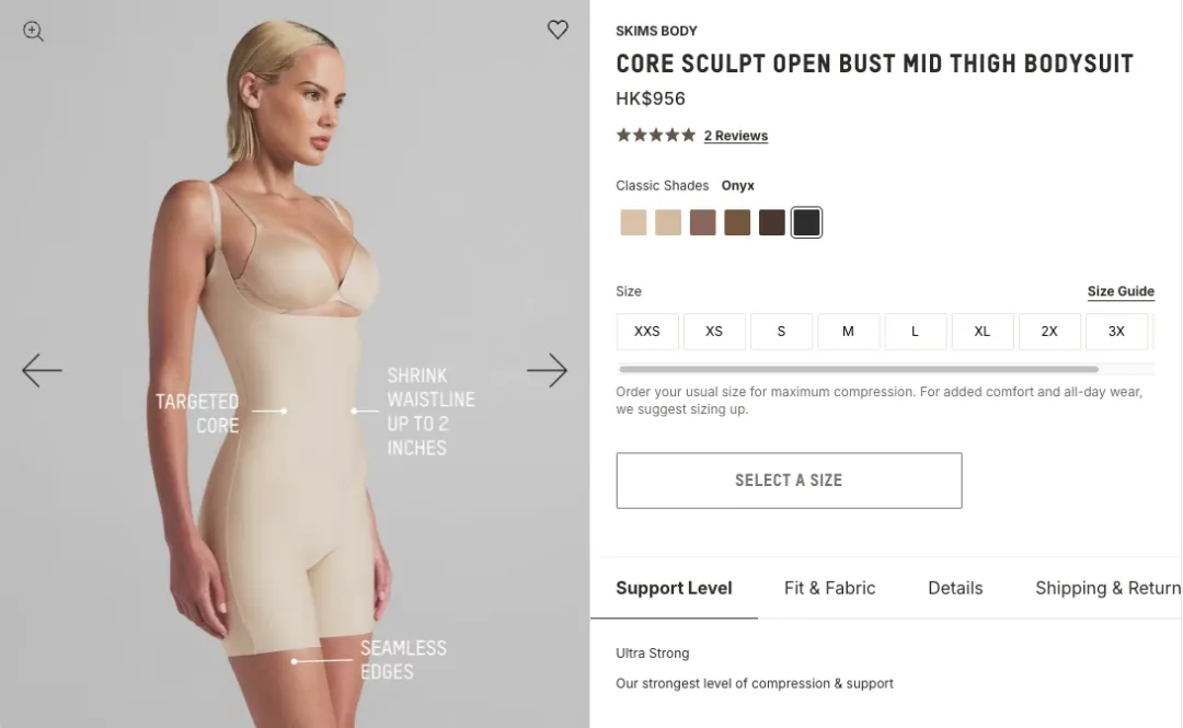 Skims 的尺码范围极为广泛,覆盖从XXS到5X,并提供多种肤色选择。更重要的是,同一款产品会由不同体型的模特进行展示,让用户能直观判断:“穿在和我相似的人身上,大概是什么效果。”在一个长期排斥“非标准身材”的行业里,Skims以开放包容的姿态欢迎所有人,也因此赢得了更为广泛且忠诚的用户群体。