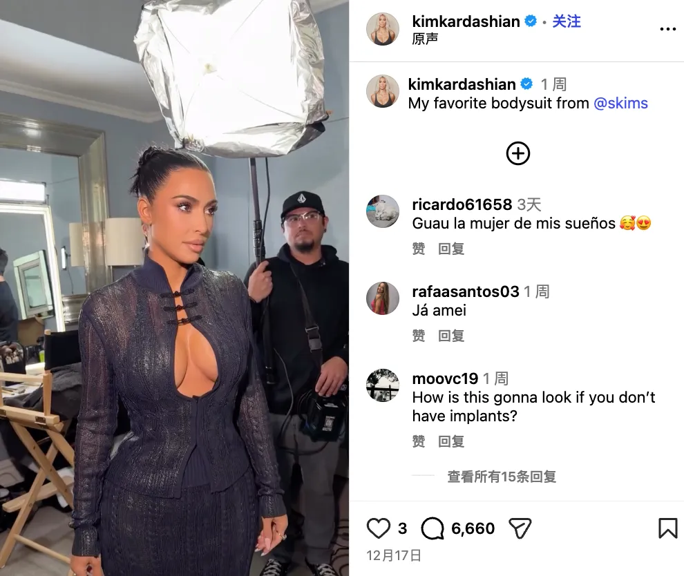 作为创始人,金·卡戴珊不仅是品牌的代言人,更是“首席体验官”。她的Instagram(超3.5亿粉丝)会提前几天发布新品预告,互动量远超品牌官方账号;她还会分享自己穿Skims的真实感受,这种真情实感的分享比硬广更有说服力。
