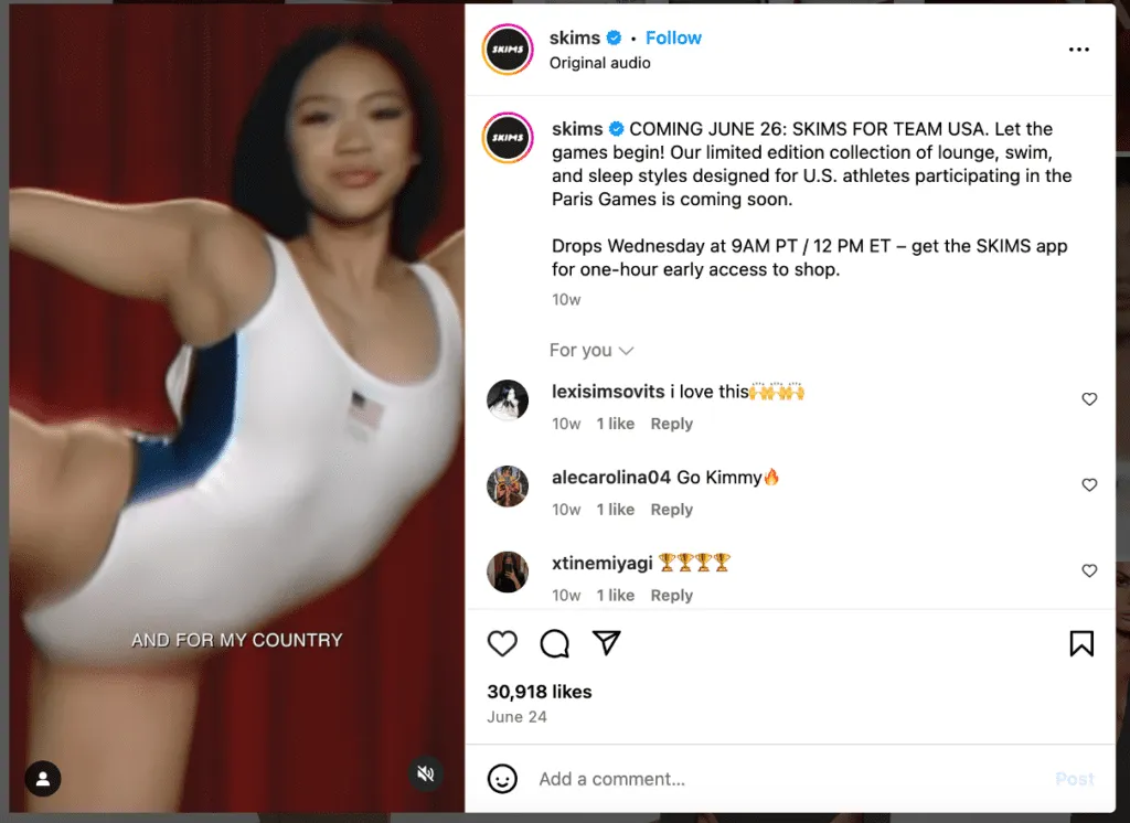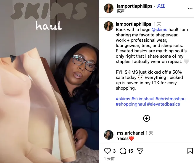 Skims的社交媒体并不只是展示产品,而是在持续和用户说话。品牌会分享新品预览、幕后花絮等生活化内容,拉近与用户的距离。同时鼓励用户使用 #skimshaul 等标签,分享自己的购物体验和穿着感受,把消费者转化为品牌内容的一部分。