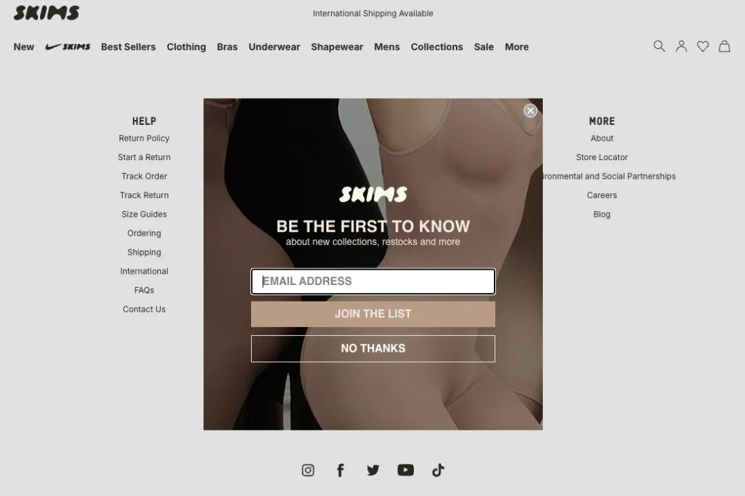 Skims的转化能力体现在每一个细节之中。当用户访问官网时,地理定位弹窗会主动引导用户选择国家和货币,避免因汇率、地区问题影响购物体验;浏览一段时间后,会弹出新闻简报注册窗口,不使用折扣诱惑,而是强调“加入可优先获得新品和最新资讯”,既营造了专属感,又不会贬低品牌价值。