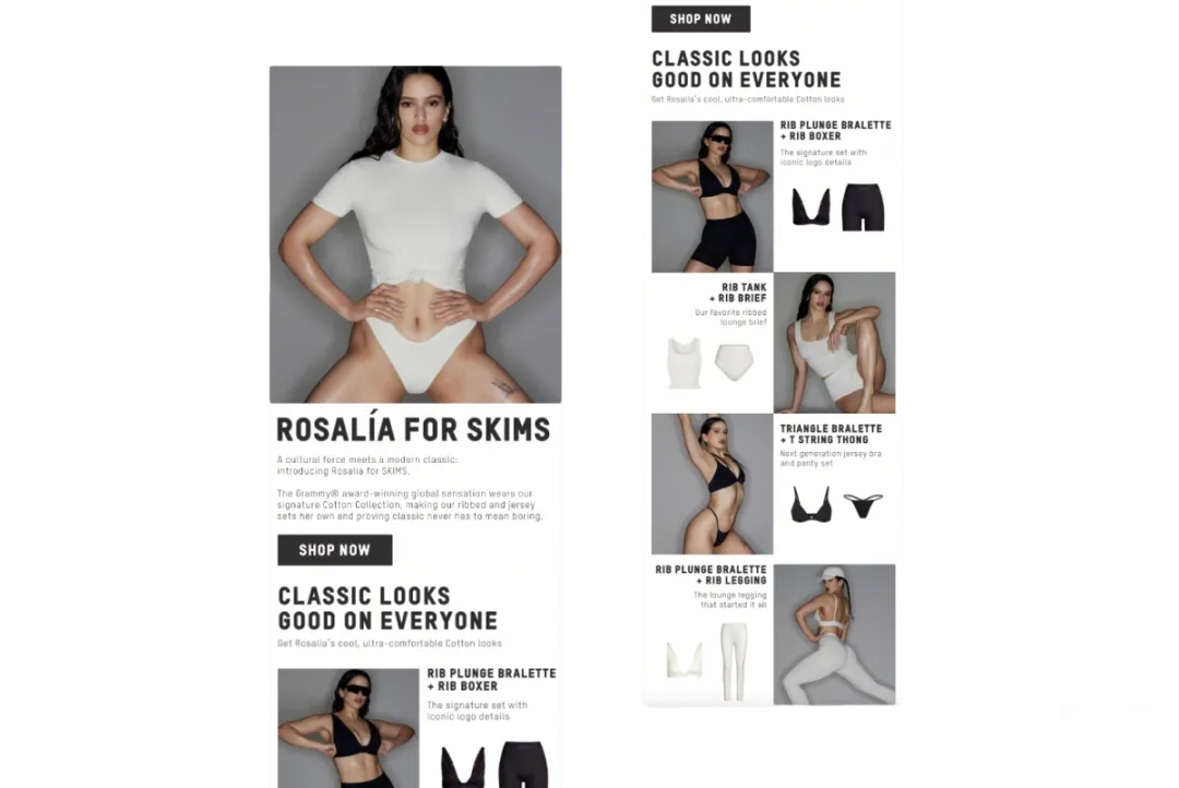 此外,Skims平均每周发送5封电子邮件,及时推送新品发布、补货、活动等信息,让用户持续关注品牌动态。这种“细节优化+持续触达”的组合策略,有效提升了转化率和用户忠诚度,为品牌的长期发展奠定了坚实基础。