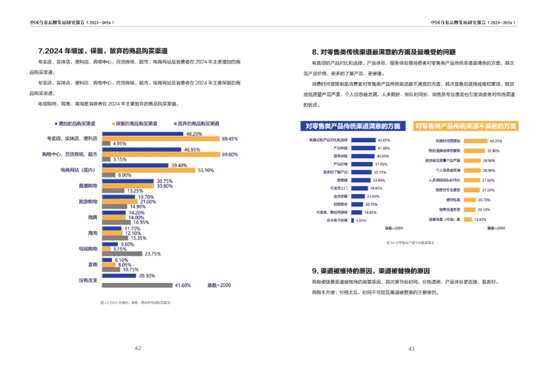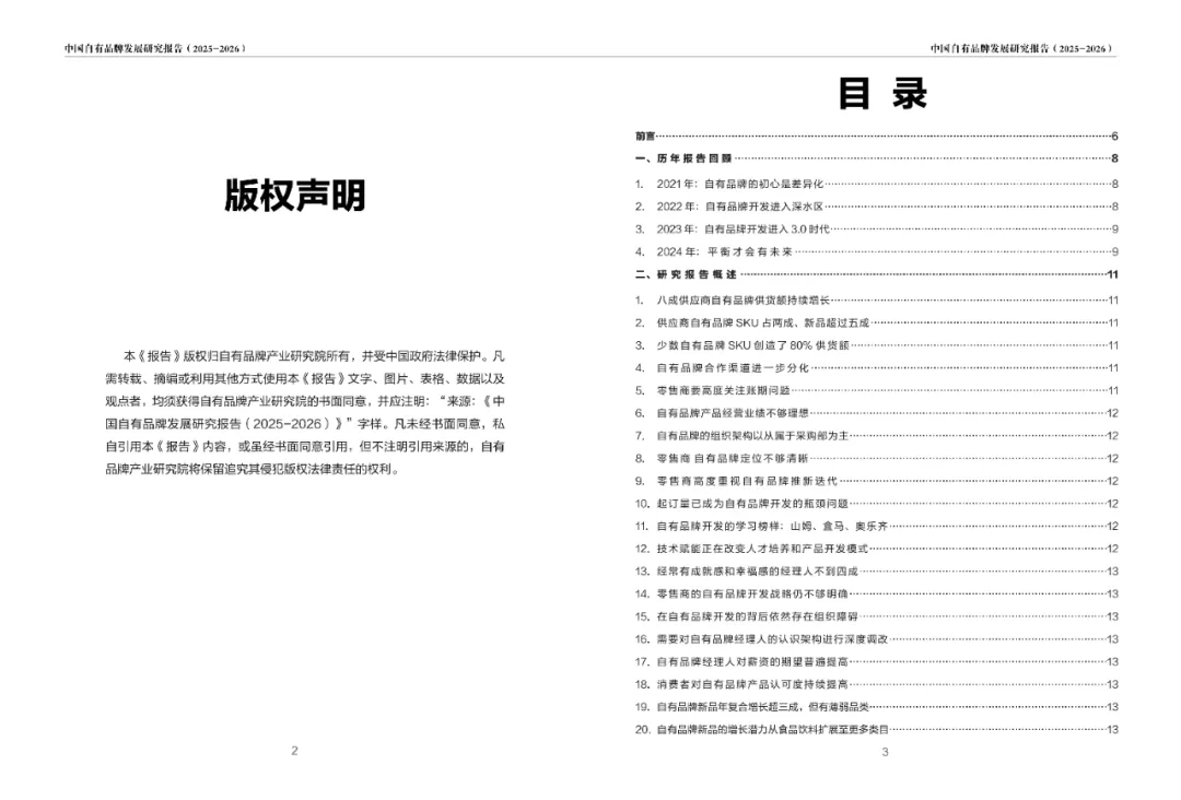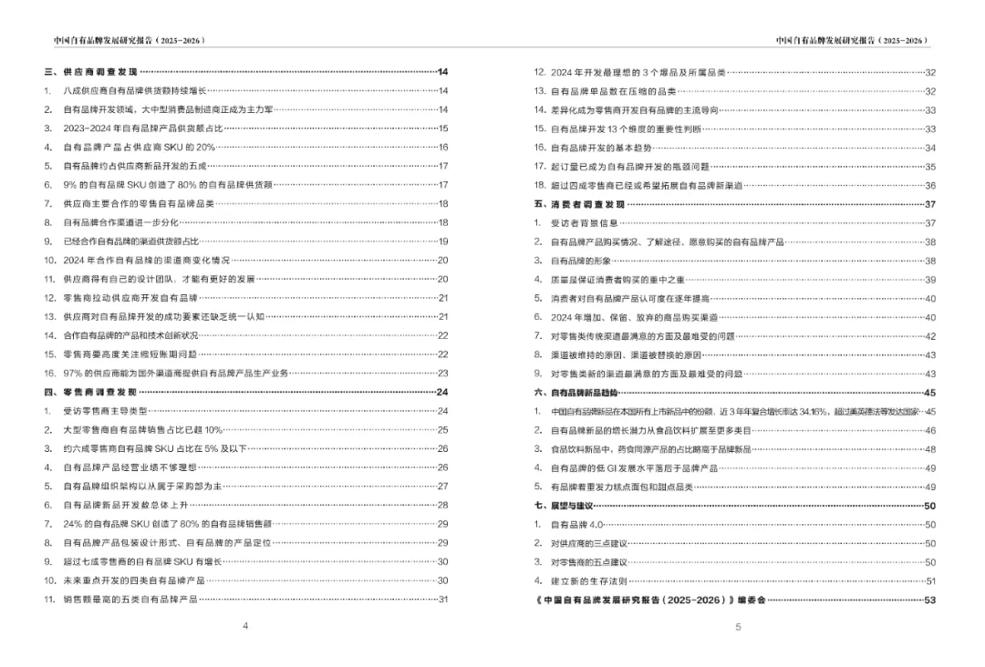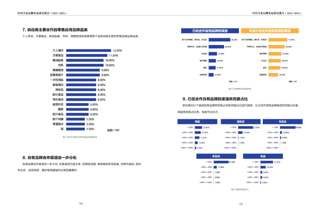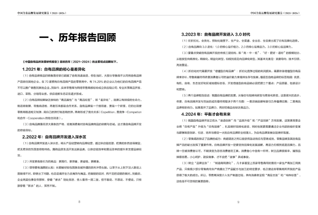 《中国自有品牌发展研究报告(2025-2026)》由自有品牌产业研究院联合多家行业协会与学术机构发布,系统梳理了中国自有品牌的发展历程、现状与未来趋势。报告指出,自有品牌已从早期的价格导向(1.0阶段)逐步演进至以品牌力为核心(3.0阶段),并正向以生态力为特征的4.0阶段过渡。调研数据显示,2024年八成供应商自有品牌供货额持续增长,大中型消费品制造商正成为开发主力;零售商方面,自有品牌销售占比已超10%,但产品定位不清、起订量大、组织架构依赖采购部门等问题仍突出。消费者对自有品牌的认可度逐年提升,购买意愿增强,尤其关注性价比与产品质量。报告强调,未来自有品牌将向更多品类扩展,技术赋能、数字化运营及供应链协同将成为关键驱动力,并建议零售商从组织架构、用户需求洞察、零售生产力提升等多方面进行系统性优化,以应对市场两极分化与消费主权崛起的挑战。
