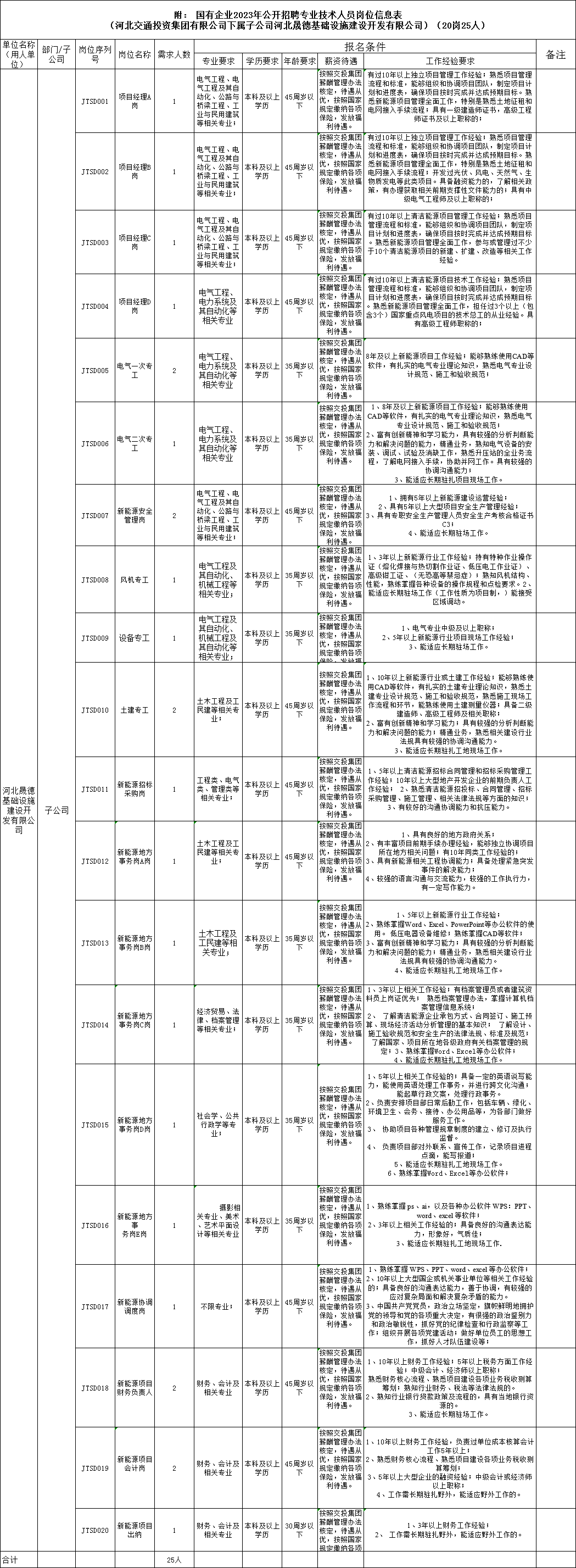 河北晟德基础设施建设开发有限公司面向社会公开招聘专业技术人员25名。具体岗位、招聘人数、资格条件等详见《晟德公司2023年社会招聘人才需求表》
