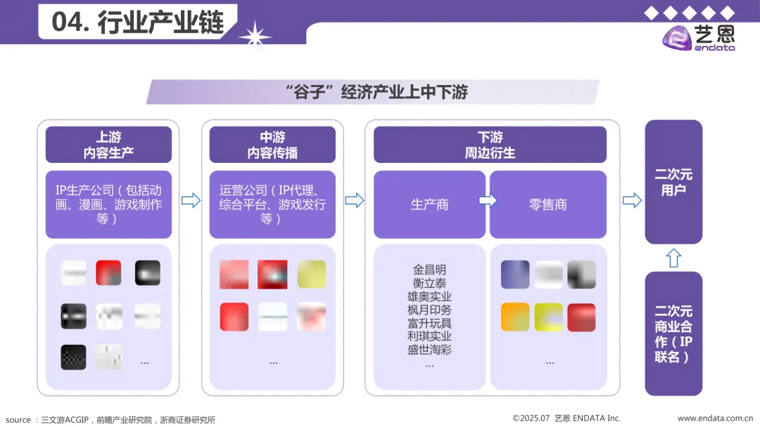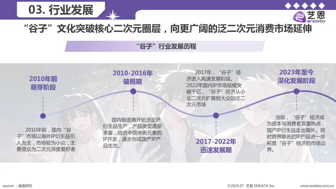 谷子经济围绕二次元 IP 周边商品展开,其核心概念“谷子”即“Goods”音译,涵盖徽章、挂件、手办等周边商品。报告指出,谷子经济经历了从萌芽到深化发展的阶段,2010 年前以海外 IP 引入为主,2010 - 2016 年国内制造商开始涉足,2017 - 2022 年进入高速发展期,2023 年至今国产 IP 衍生品走向海外,跨界联名拓宽市场边界。谷子经济产业链涵盖内容生产、传播与周边衍生,IP 生产公司、运营公司、生产商和零售商等各环节紧密协作。