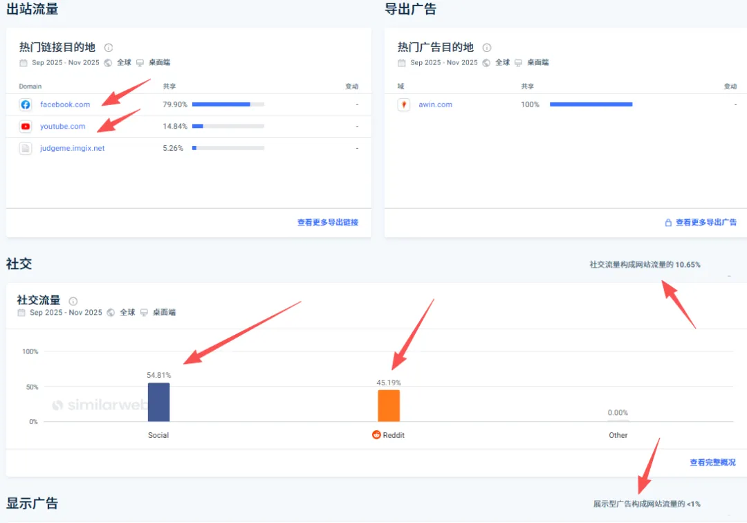 通过similarweb的流量来源渠道查看,自然搜索+社交流量构成了网站的核心流量来源,尤其是Reddit。