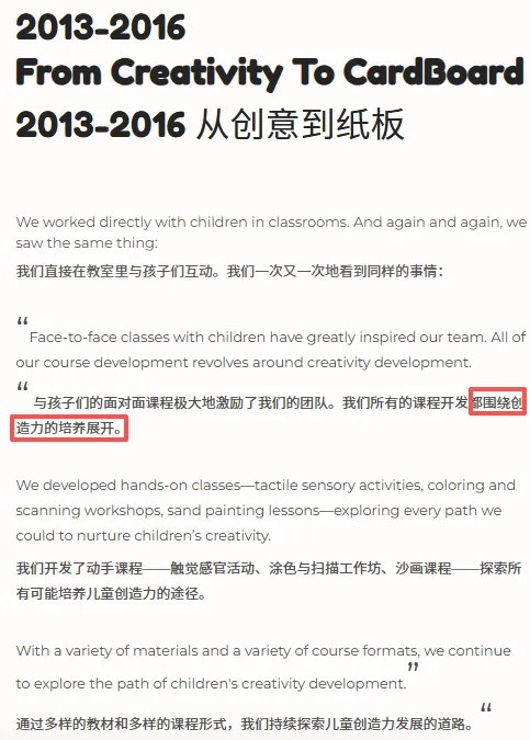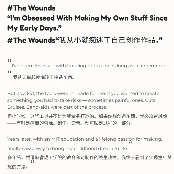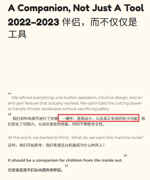 通过创始人口吻,以儿童纸板切割机为切入点,从想法萌芽,学习实践,原型迭代,绘制形象,产品检测,推出市场,到全球使命的品牌故事介绍,我们首先能看到的是:做产品的“精心”。