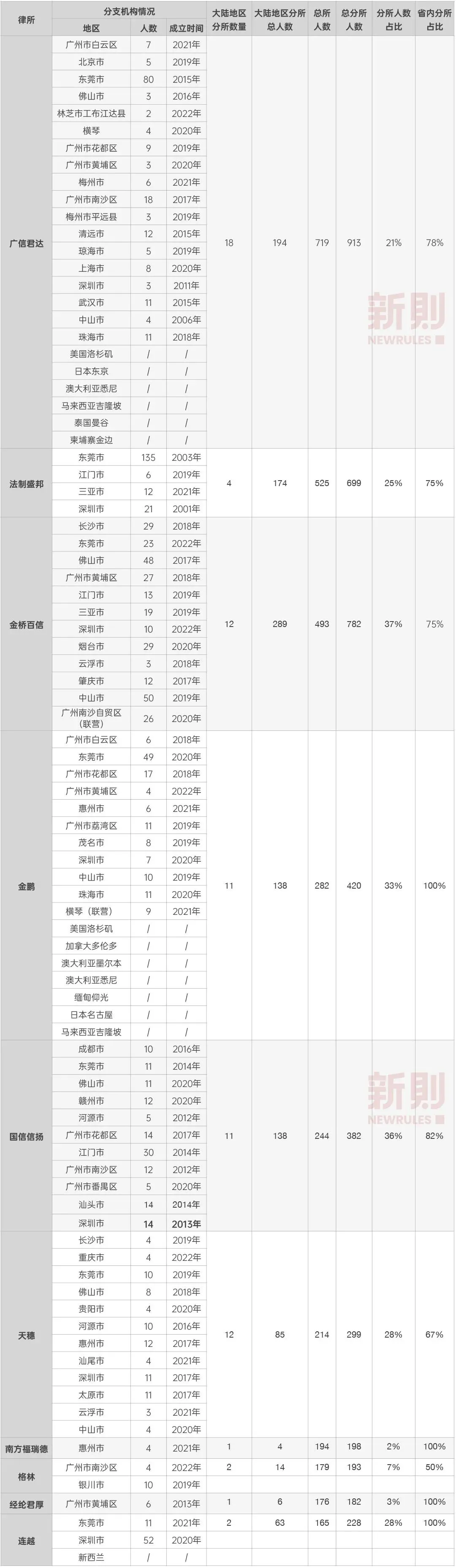 成立时间均较长,其前身多可追溯至改革开放后设立的首批律师事务所; 在发展过程中多经历了至少一次律所间吸收或合并,以较快速度发展做大; 分所多集中于广东本省甚至广州同城,向全国扩张动力不强; 国际化程度较高,多设立港澳联营律所、海外分支机构等。