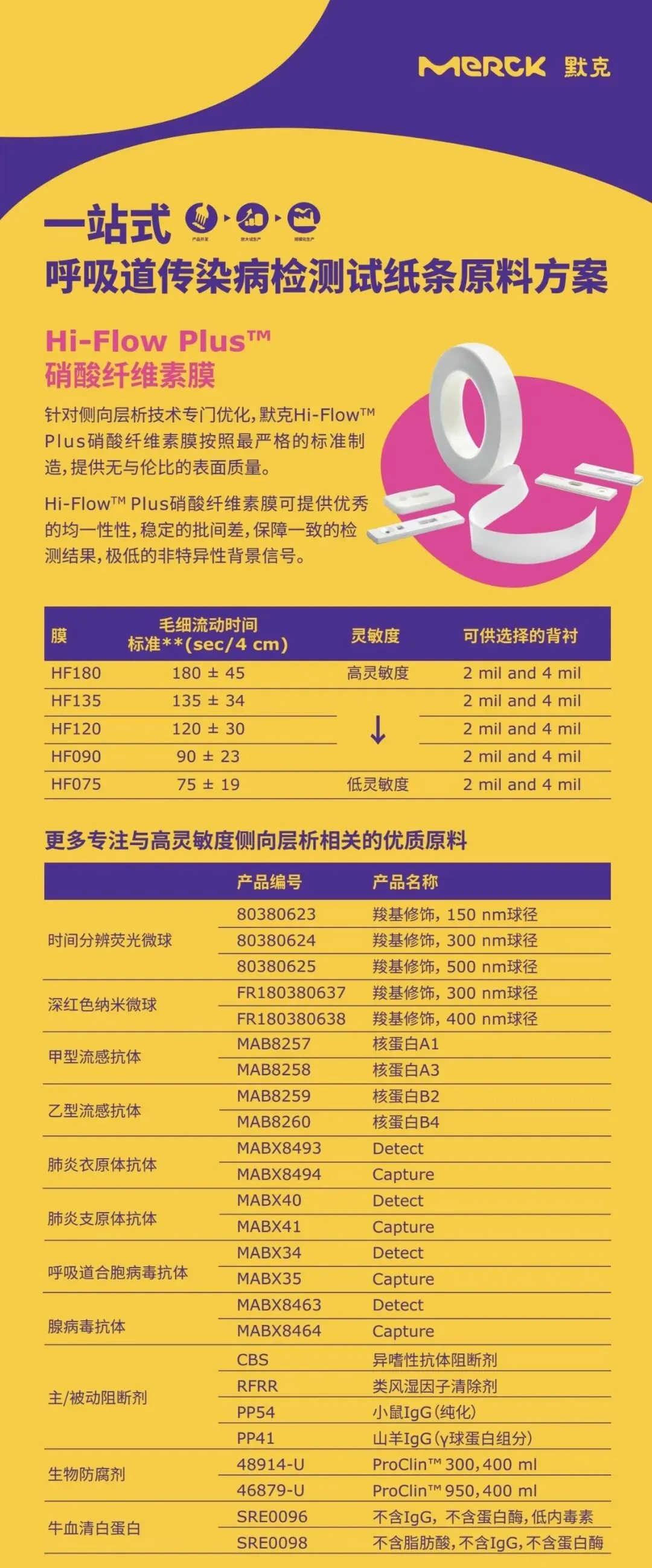 作为知名的诊断原料供应商,默克为诊断试剂生产厂家提供硝酸纤维素膜、玻璃纤维、乳胶微球等核心原料。同时,针对8000余种疾病可提供高质量、经过验证的抗原和抗体对产品。从膜材、微球、抗体到化学试剂,用高品质的产品确保试剂盒的灵敏、可靠,满足全球诊断试剂生产商的要求。