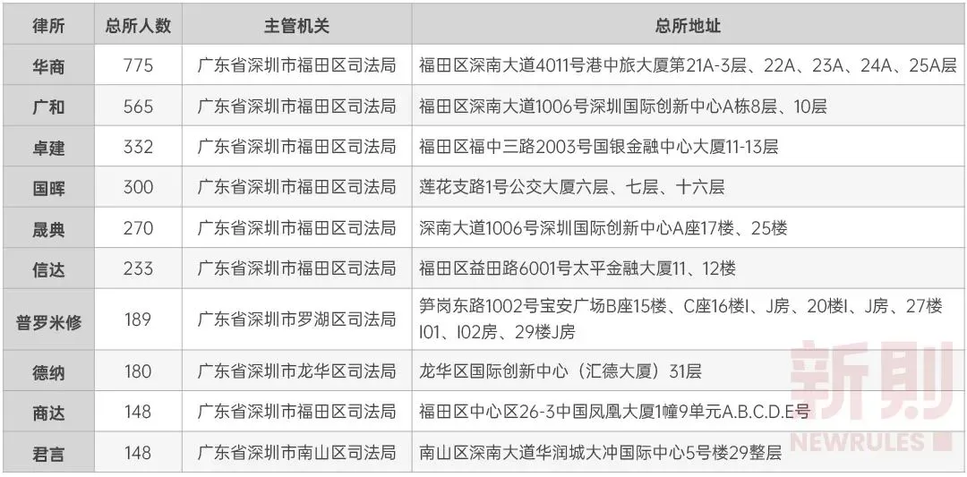 本文是新则区域规模律所品牌竞争力分析系列的第七篇(点击查看第一篇:湖南篇;第二篇:福建篇;第三篇:杭州篇;第四篇:江苏篇;第五篇:上海篇;第六篇:广州篇),我们选取了总部位于深圳市的10家规模最大、实力最强的本土律所,从品牌竞争力的角度,通过整体品牌印象、规模化扩张、品宣运营三个维度,分析各自优势。中国改革开放40余年,一段波澜壮阔、无可复制的历史,如果浓缩到一个城市上,那个城市必然是深圳。深圳作为改革开放的经济特区,也是全球经济发展最快的城市之一,仅用了不到40年的时间,就从一个小小的渔村变成了现在的国际化大都市,深圳的发展史,堪称“奇迹”。2021年,深圳的地区生产总值达到30664.85亿元,紧随上海、北京,成为中国第三个GDP超过三万亿的城市。以“快”和“强”著称的深圳特色,同样体现在深圳律师行业中。经过连续多年的高速增长,截至2021年底,深圳共有执业律师19206人,同比增长15.7%。深圳律师人数列北京、上海、广州之后,位居全国大中城市第四。从创收来看,2021年,深圳全市共有律师事务所1084家,其中有上报的952家律师事务所业务总营收约为113.6亿元,较2020年增长20.5%。不仅如此,可以预见的是,深圳律师行业在未来数年中仍将保持高速增长。根据《深圳律师行业“十四五”发展规划》,到2025年前,深圳律师计划突破30000名,超过广州律师预期人数。同时,总创收要实现200亿目标,人均创收相比2021年要增长30%。通过研究深圳本土规模律所发展特点,我们也得以窥见深圳律师行业的快速发展态势——未来,深圳律师行业能否在北京上海律师行业之外,走出不一样的发展道路,值得期待。根据全国律师执业诚信信息公示平台,我们检索(检索时间2022/11/10)到总所位于深圳市、总所人数最多的10家律师事务所:广东华商律师事务所、广东广和律师事务所、广东卓建律师事务所、广东国晖律师事务所、广东晟典律师事务所、广东信达律师事务所、广东普罗米修律师事务所、广东德纳律师事务所、广东商达律师事务所、广东君言律师事务所。