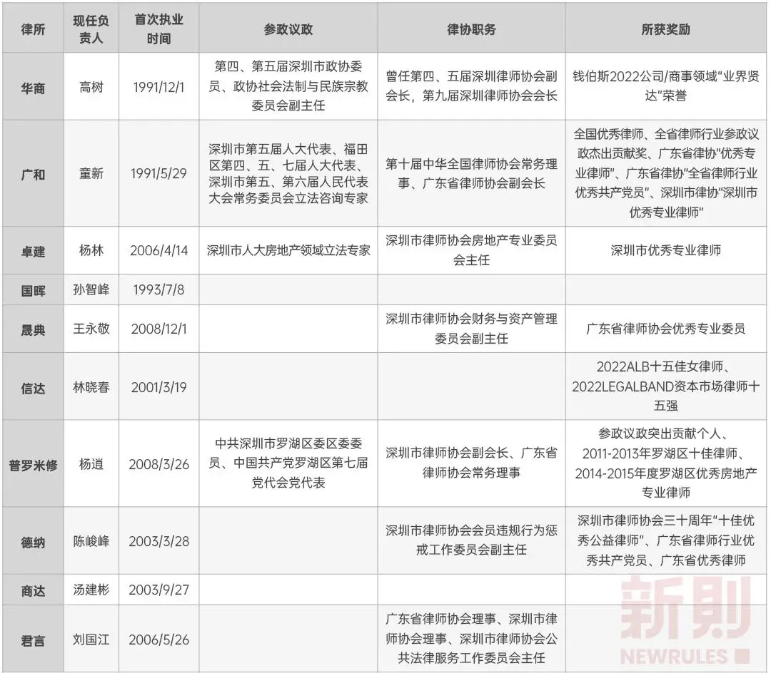 注:检索来源为全国律师执业诚信信息公示平台、各律所官网及微信公众号,空白处代表未能检索到结果,如有错漏,欢迎留言指出。在10家规模律所的现任负责人中,绝大部分均积极参政议政,担任各级律协职务,并获得如“全国优秀律师”“广东省优秀律师”荣誉及国际评级机构肯定。02.