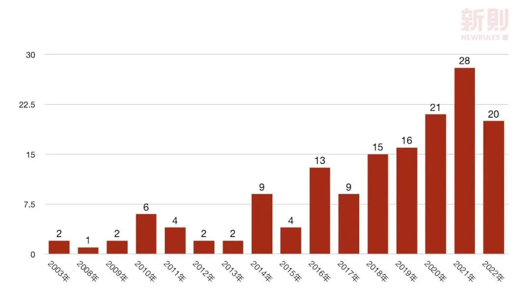注:检索来源为全国律师执业诚信信息公示平台;普罗米修律师事务所官网显示有揭阳分所,但在全国律师执业诚信信息公示平台上没有显示,故未纳入统计。相较于同为一线城市的上海与广州,深圳市本土规模律所的规模化状况呈现出更积极的态势:从律师人数来看,华商律师事务所总分所律师总人数已达到1523人,居广东本土规模律所之最,而广和律师事务所总分所律师共981人,规模也相当可观。从律师构成来看,分所律师比重明显更高。10家规模律所的分所律师人数占全体的比重平均值为37.9%,而广州10家最大规模律所的这一数字为22%。华商律师事务所、国晖律师事务所的分所总律师数量与总所持平,而普罗米修律师事务所、商达律师事务所的分所总律师数量已经超过总所。从设立国内分所的具体情况来看,10家规模律所在大陆地区平均设立分所15.4家,其中华商律师事务所分所数量高达35家,为本系列统计本土规模律所分所数量之最。此外,国晖律师事务所26家分所、广和律师事务所和普罗米修律师事务所22家分所,其数量也相当可观。分所数量最少的晟典律师事务所也拥有4家分所。并且,深圳市本土规模律所扩张的步伐仍在继续。如华商律师事务所官网显示“上海、云南等地的分支机构正在积极筹建中”,卓建律师事务所“正在覆盖北京、上海、武汉、成都、沈阳、香港、澳门及深圳前海等中心城市”。深圳本土规模律所仍在积极进行分所布局。广州本土规模律所设立分所时更倾向于选择本省其他城市,如东莞、深圳、佛山、中山,均为广东省GDP排名靠前的几大城市,省内分所平均占比高达83%。而与此截然不同,深圳10家本土规模律所的省内分所平均占比仅为57%,也就是说,深圳本土规模律所把接近一半的分所都设在了省外。可以看出,最受欢迎的分所设立地包括了:前海,这得益于其独一无二的政策优势;深圳龙岗区,也是深圳的工业强区、华为公司总部所在地,而10家规模律所中7家总部均位于福田区,深圳的金融中心;再往下是广州和东莞,广东省GDP排名靠前的两个城市;值得注意的是,10家规模律所中有6家选择逆势北上,进入北京,而广州的10家规模律所中仅有1家。这也体现出深圳律所的魄力。深圳本土规模律所大多从2018年开始才密集布局分所,在短时间内推进了绝大多数分所设立完成。从下图中可以看出明显趋势:此前据我们统计,从全国范围规模律所来看,大部分律所都是在过去10年内,即2012年左右,开始重点推动自身的规模化发展(点击查看详情)。显然,深圳规模律所的推进时间要更晚一些。在政策引导及市场需求之下,深圳律所自然将涉外法律服务作为自身发展的策略板块之一。在《深圳律师行业“十四五”发展规划》中,明确提出到2025年前,深圳律所在境外设立分支机构要达到50家、开展涉外业务的律师事务所达到300家。而据不完全统计,截止到2022年3月,深圳市有5家律师事务所在境外开设了10家分所。为实现2025年目标,深圳推出了鼓励深圳律师事务所在粤港澳大湾区及内地设立分支机构以及设立深圳与香港、澳门合伙联营律师事务所、探索中外律师事务所协议联营试点等举措。在国际化方面,深圳市本土规模律所理所应当走在了前面。2014年11月,华商林李黎(前海)联营律师事务所在前海设立,成为中国第一家内地与香港联营的律师事务所,此后华商还设立了华商萧一峰(海口)联营律师事务所等数家联营律师事务所。在港澳台及国外地区,据不完全统计,华商律师事务所、广和律师事务所和信达律师事务所等均设有分支机构。03.