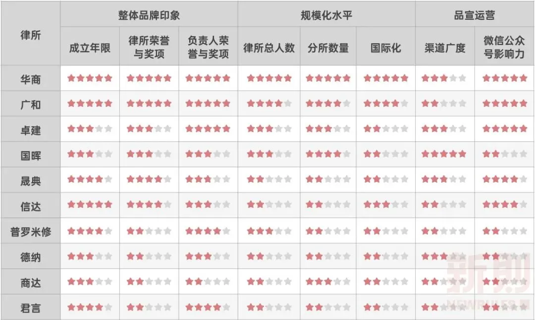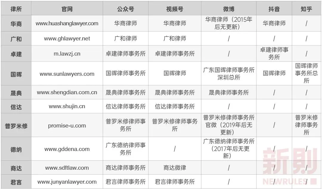 我们梳理了10家规模律所的官网及主要社交媒体账号(微信公众号、微信视频号、微博、抖音、知乎、小红书)信息: