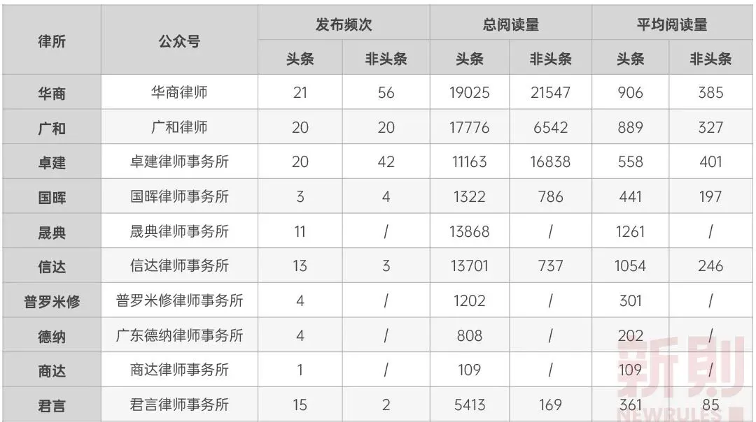 从更新频次来看,华商、广和、卓建更新稳定、频次和数量较高,基本为工作日日更,说明这些律所对于公众号运营有较高的要求和明确的规划;从阅读量来看,华商、晟典、广和等律所的表现更突出。