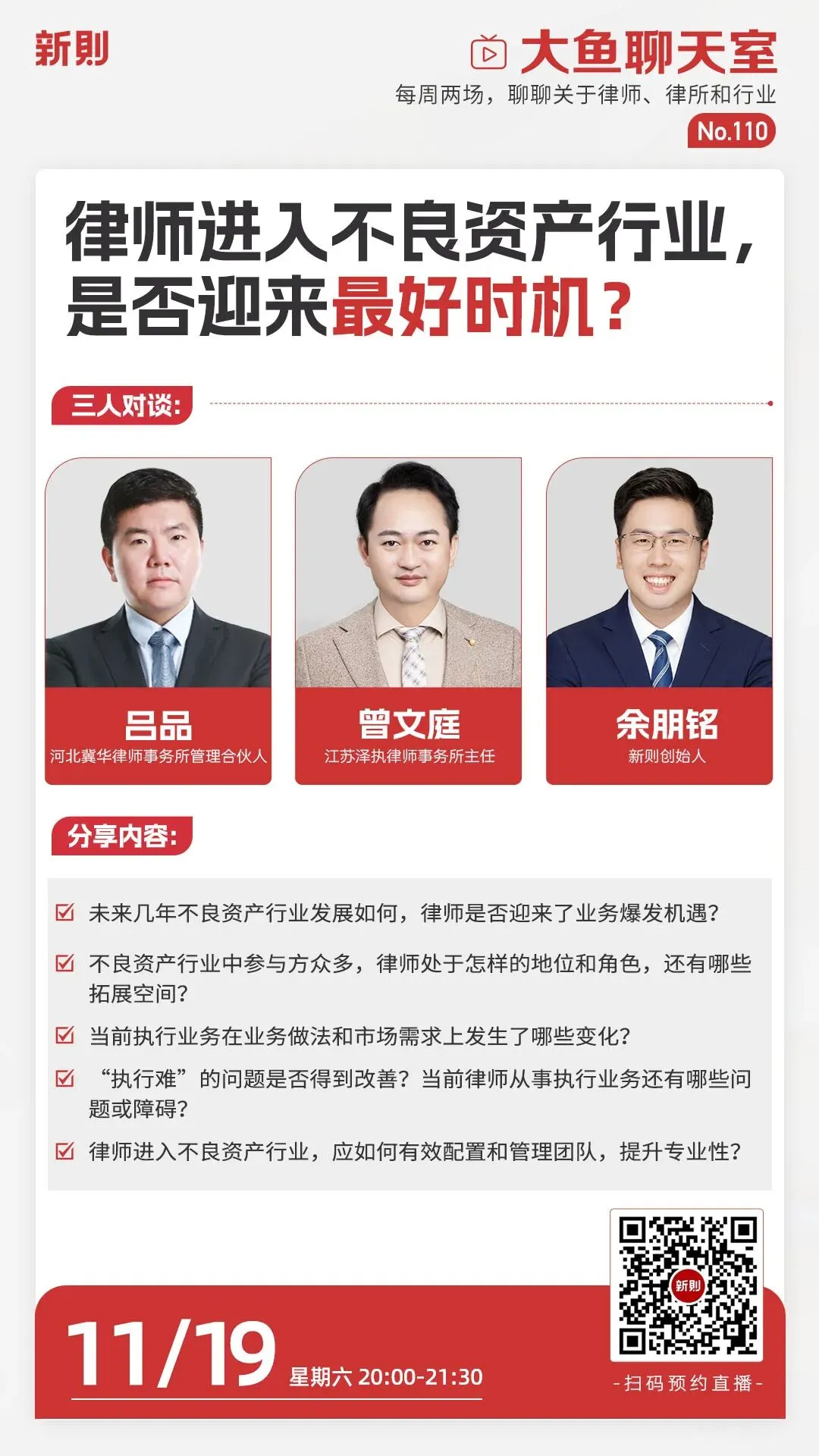 11月19日(本周六)晚上8点,大鱼聊天室三人对谈,我们邀请到了河北冀华律师事务所管理合伙人吕品,和江苏择执律师事务所主任曾文庭,一起聊聊“律师进入不良资产行业,是否迎来最好时机?”,欢迎扫码预约直播。