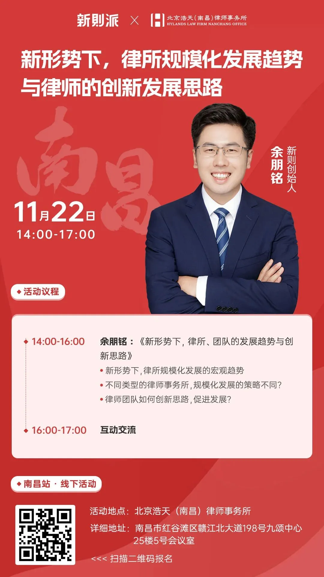 11月22日(下周二)下午2点,新则派来到北京浩天(南昌)律师事务所,一起聊聊“新形势下,律所规模化发展趋势与律师的创新发展思路”,欢迎扫码报名。