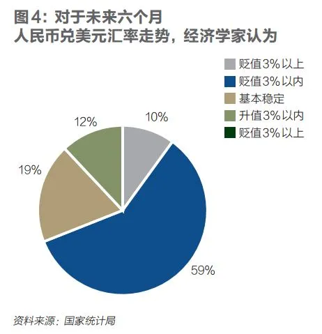 对于未来六个月人民币兑美元汇率走势,调查结果显示,10%的经济学家预期“贬值3%以上”,比上季度增加9个百分点;59%预期“贬值3%以内”,大幅增加31个百分点;19%预期“基本稳定”,减少20个百分点;12%预期“升值3%以内”;没有经济学家预期“升值3%以上”(见图4)。