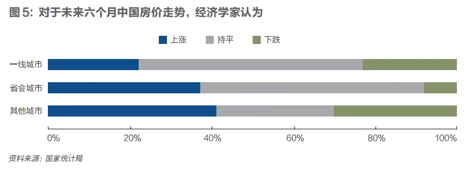 关于房价走势,调查结果显示,对于北上广深等一线城市,22%的经济学家预期未来六个月房价“上涨”,比上季度增加13个百分点;55%预期“持平”,增加11个百分点;23%预期“下跌”,减少24个百分点。对于省会城市,37%的经济学家预期“上涨”,比上季度增加16个百分点;55%预期“持平”,减少9个百分点;8%预期“下跌”,减少7个百分点。对于其他城市,41%的经济学家预期“上涨”,比上季度增加11个百分点;29%预期“持平”,减少6个百分点;30%预期“下跌”,减少5个百分点(见图5)。