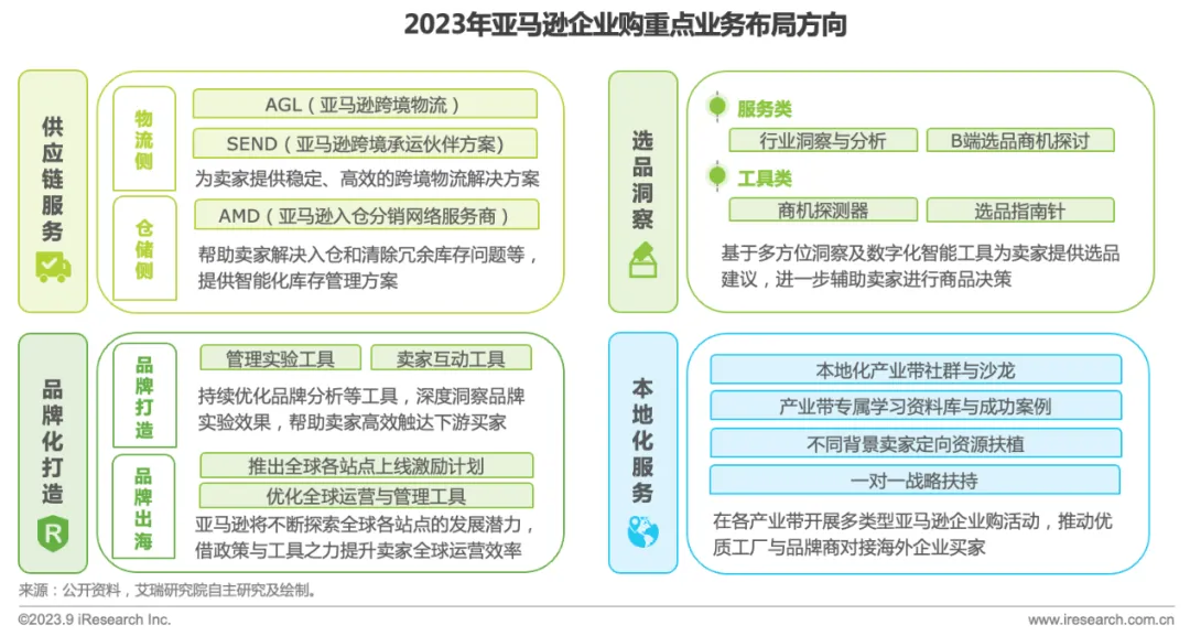 历经近十年探索与沉淀,亚马逊企业购根据中国卖家的需求与痛点积极开展全链路服务与产品的布局,目前已触达全球600万+企业及机构买家。2023年亚马逊企业购将继续围绕供应链服务、选品洞察、品牌化打造以及本地化服务四个业务方向,不断提升全链路服务能力,赋能中国优质工厂与品牌商开拓海外站点。