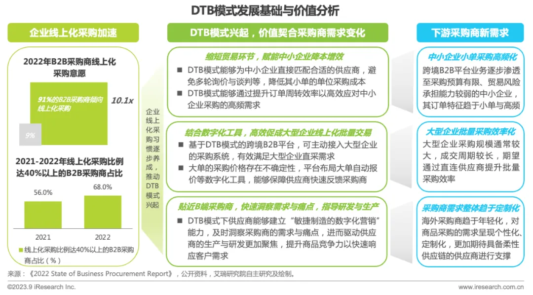 调研数据显示,2022年超九成采购商会选择通过线上化渠道来满足自身采购需求, 2022年线上化采购比例达40%以上的B2B采购商占比达到68%,相比2021年增长12%,B2B采购商线上化采购习惯逐步养成,驱动B2B线上化进程持续深化,不断缩短交易链路,进一步带动DTB模式兴起。跨境出口B2B平台基于DTB模式能够进一步赋能中小企业降本增效、高效促成大型企业线上化批量交易以及指导供应商定制化研发与生产,DTB模式所释放的价值能够契合下游各类型采购商的需求变化,极大提高B2B买卖双方的交易效率。