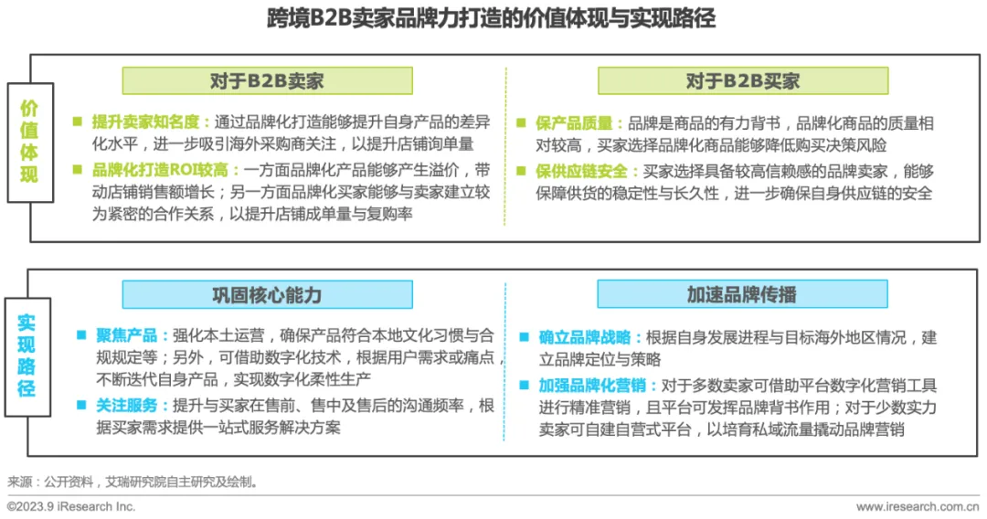 中国跨境出口电商产业带已具备一定的产研能力,而跨境卖家从“产研一体化”演化至“产研销一体化”则存在较多难点,如缺乏品牌意识、营销能力亟待提升以及缺乏数字化管理能力等,导致销售链路运作效率较低,目前“产研销一体化”模式尚处探索阶段。跨境出口B2B平台作为连接产业链上下游的中间者角色,通过提供品牌出海解决方案、营销资源支持以及驱动供应链协同等方式赋能上游卖家的供应链向销售端延伸,这将助力跨境卖家逐步实现“产研销一体化”。