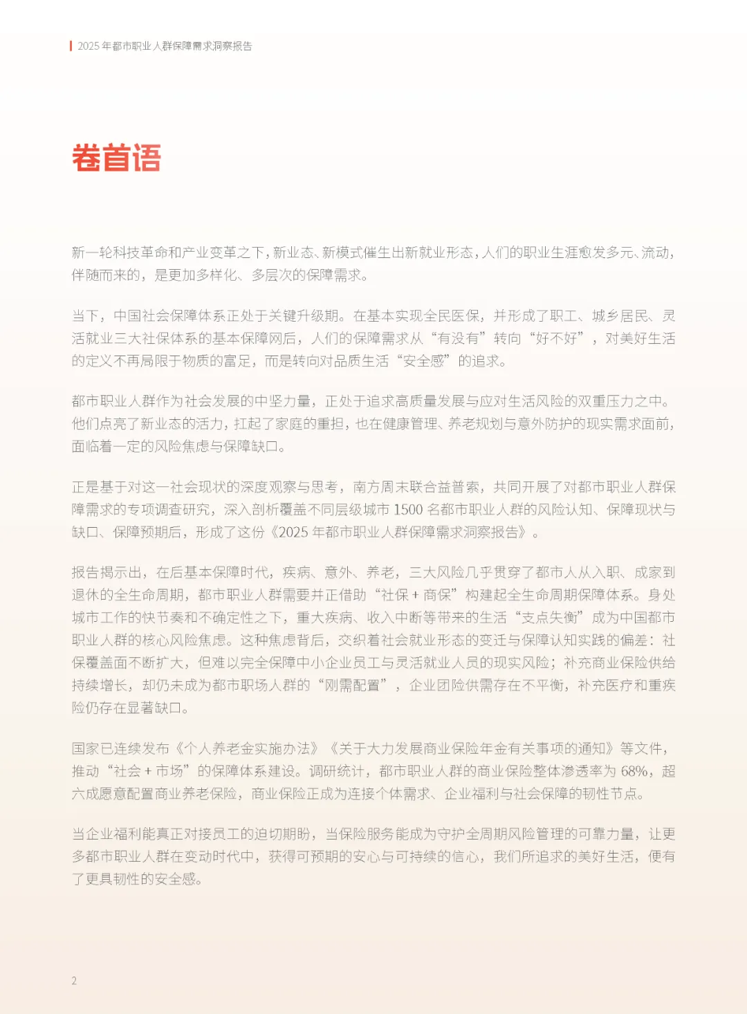 在科技革命与产业变革的浪潮中,新就业形态如雨后春笋般涌现,都市职业人群的职业生涯变得愈发多元与流动。随之而来的,是他们对保障需求的多样化与精细化。《2025年都市职业人群保障需求洞察报告》由南方周末与益普索联合发布,通过对覆盖8个城市的1500名都市职业人群的深度调研,揭示了后基本保障时代下,都市人面临的健康、养老、意外等风险,以及他们对“社保+商保”全生命周期保障体系的迫切需求。本报告不仅为政策制定者、企业雇主及保险机构提供了宝贵的数据支持与策略建议,更为每一位都市奋斗者描绘了一幅安心与可持续的未来图景。