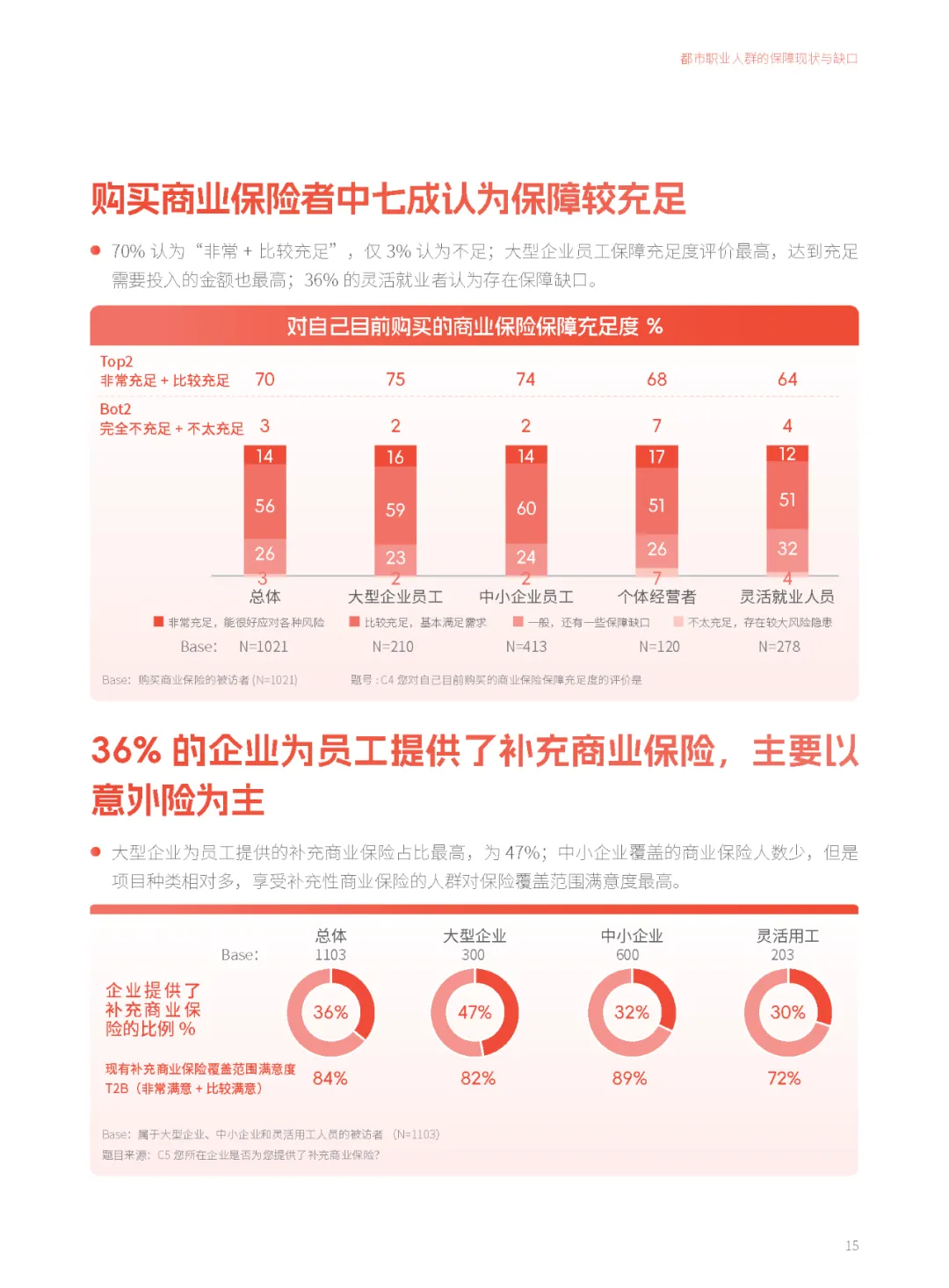 灵活就业群体作为都市职业人群的重要组成部分,其保障需求同样不容忽视。报告指出,灵活就业人员对商业保险的购买比例和投保金额均低于其他职业人群,保障信心最弱。已购商保的灵活就业者中,36%认为存在保障缺口,对退休后经济来源的预期低于总体水平。用工平台和保险机构需联手,提供低门槛、普惠型的定制化产品方案,以满足灵活就业群体的特殊需求,填补其保障信心缺口。